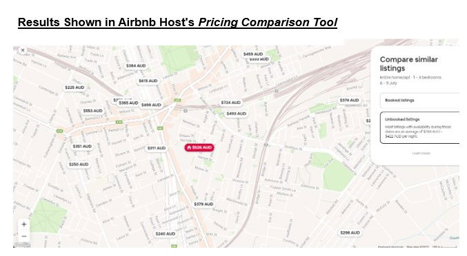 Additionally, different properties were shown between the host tool and guest search results. Airbnb claims to display listings similar to the host's property based on factors such as "location, size, features, amenities, ratings, and reviews." However, we were unable to identify a pattern to explain the varying results. For example, our Newtown house has a rating of 4.9+ with over 120 reviews, but the host tool displayed many properties with fewer than 10 reviews and some with ratings below 4.5.