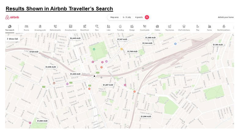 To conduct an additional test, we logged into Airbnb incognito as a traveler and searched for 2-bedroom properties in Newtown for the same dates (6-9 July). The traveler's search results showed 31 listings. However, since it displayed the total price for a 3-night stay, we had to click on each listing to find the average night rate.